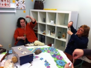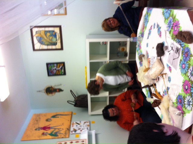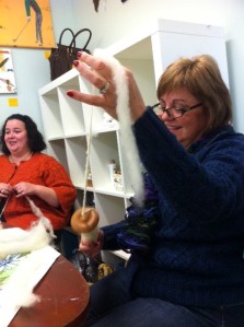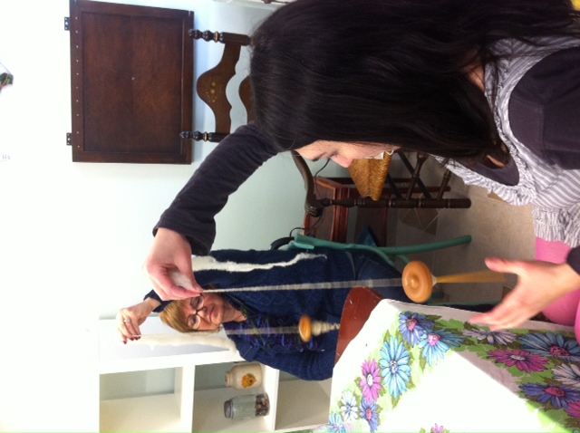When I was getting ready to open The Golden Button I met Rose Garbien from Bittersweet Ridge Farm. Rose has a bunch of Shetland Sheep and Angora Rabbits. Rose makes her own yarn and her own soap and she knits and felts!!! I wanted to learn how to make my own yarn for quite a while now…. So Rose agreed to do a Drop Spindle Workshop. Its a two part class where we learn all about different fibers and tools and how to make our own yarn. It was wonderful!